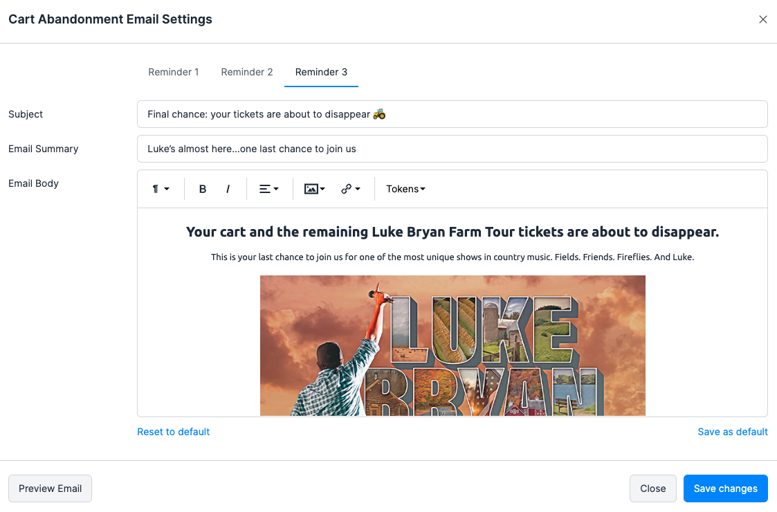 Now you can customize your cart abandonment emails directly within your Big Tickets dashboard. This upcoming release will allow you to:
