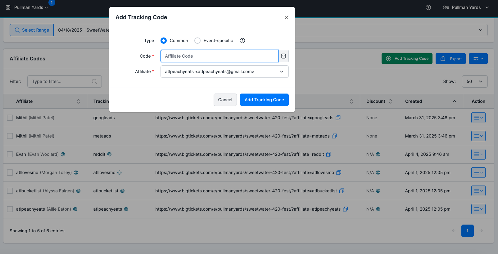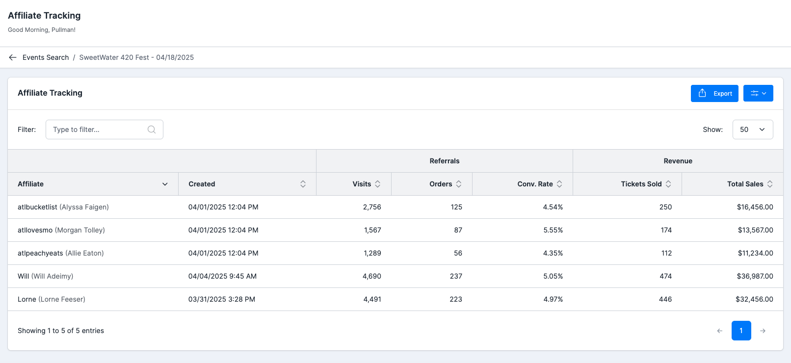 Once your event goes live, you can monitor each affiliate's activity directly from the Affiliate Tracking dashboard.