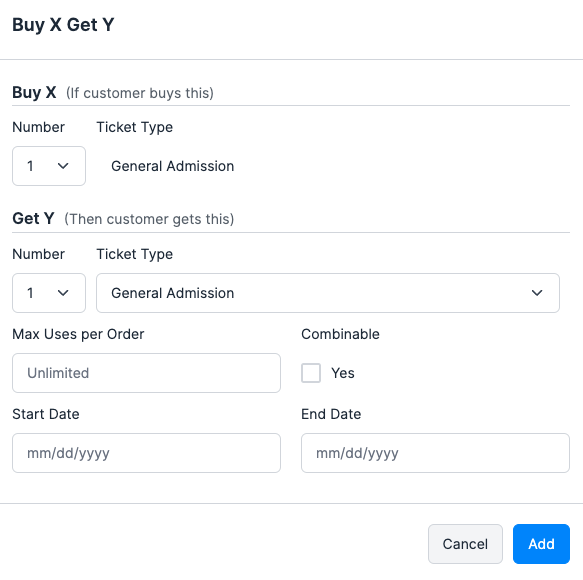 The Buy X Get Y feature on our platform allows you to create flexible "Buy One, Get One" (BOGO) and similar promotional offers that can be tailored to meet the needs of your event.