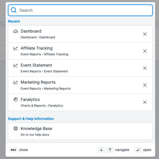 We’ve added a powerful new Dashboard Search feature to help you navigate your Big Tickets dashboard faster and more efficiently. Whether you're looking for a specific report, event setup page, or support resources, the new search makes it easier than ever.